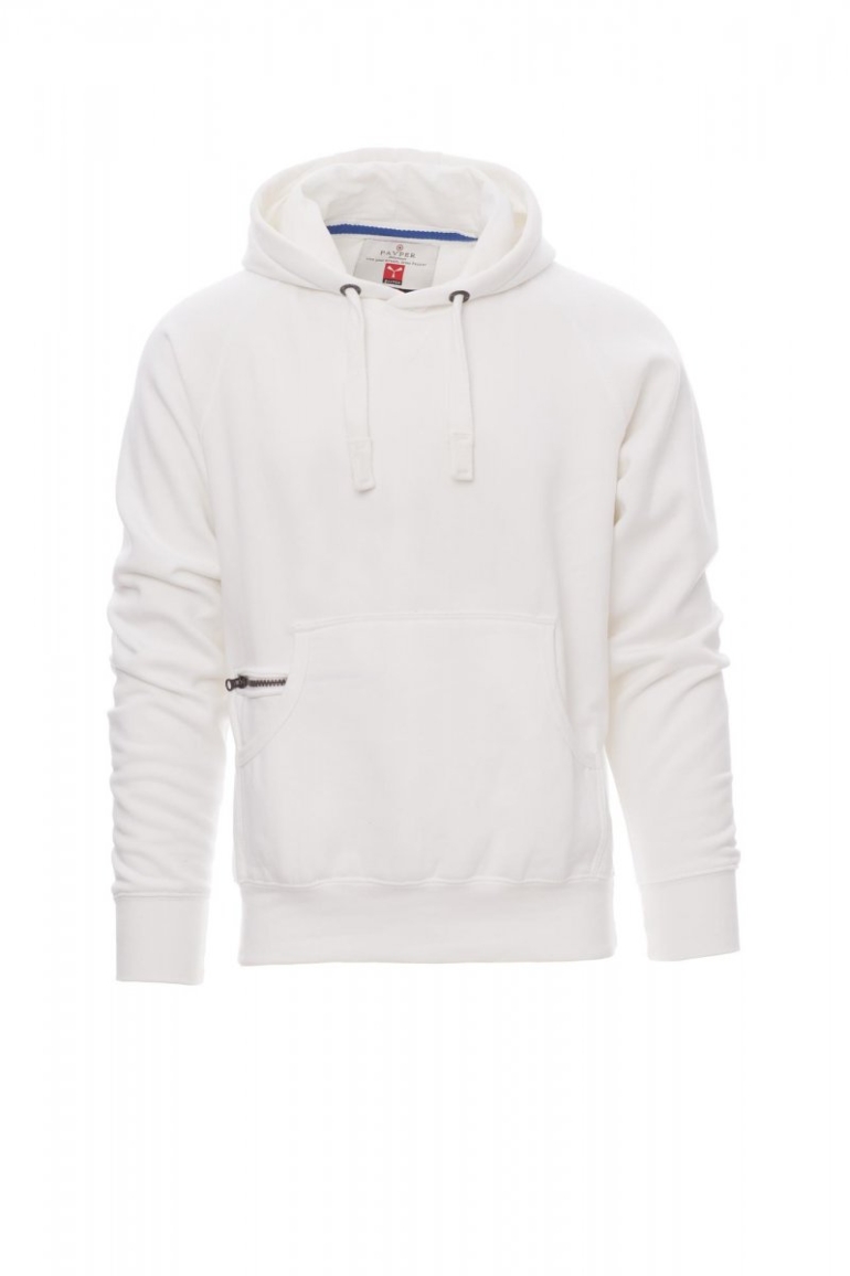 MELEGÍTŐFELSŐK_CAPPUCCIO_Férfi kapucnis melegítő dupla varratokkal és fehér állítózsinór, kontrasztos varrással és fémgyűrűkkel, raglán ujjak, V-kialakítású steppeléssel a nyaknál, kenguruzsebek, kis cipzáras zseb, sztreccsanyagból készült, bordázott mandzsettával és szegéllyel, megerősített varratokkal.