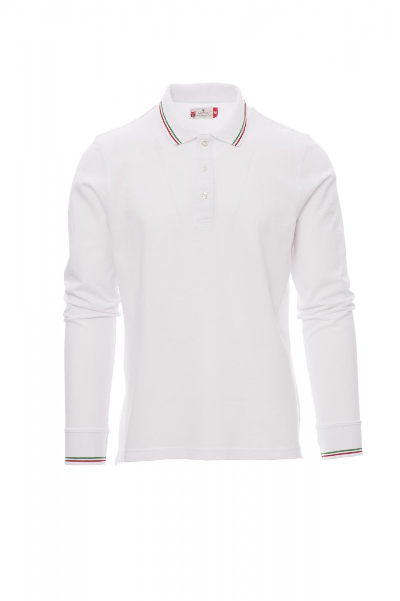 PÓLÓING_HOSSZÚ UJJÚ_Uniszex rövid ujjú pólóing 3, színben illeszkedő gombbal, gallér- és ujjdíszítés (a zászló színei), bordázott gallér és mandzsetta, oldalsó szellőzők, bújtatott varrás a gallérnál, oldalsó anyagerősítés, anyagerősítés a nyakrész belső oldalán.