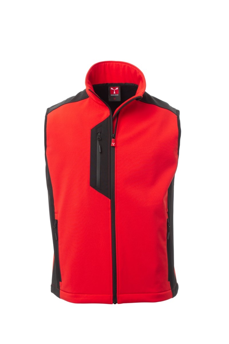 SOFTSHELL DZSEKIK_NO IMBOTTITO_WP 8000 mm H₂O, WVT 5000 g/m² 24h. Kéttónusú, 3 rétegű férfi softshell mellény cipzárral, „félautomata” (fékezős) fém cipzárkocsival és egyedi fogóval. Két oldalsó cipzáras zseb, egy vízlepergető anyaggal bevont cipzárral záródó mellzseb. A hát felső betoldásán fényvisszaverő részletek. Állítható alsó rész egyedi zsinórszabályozóval.