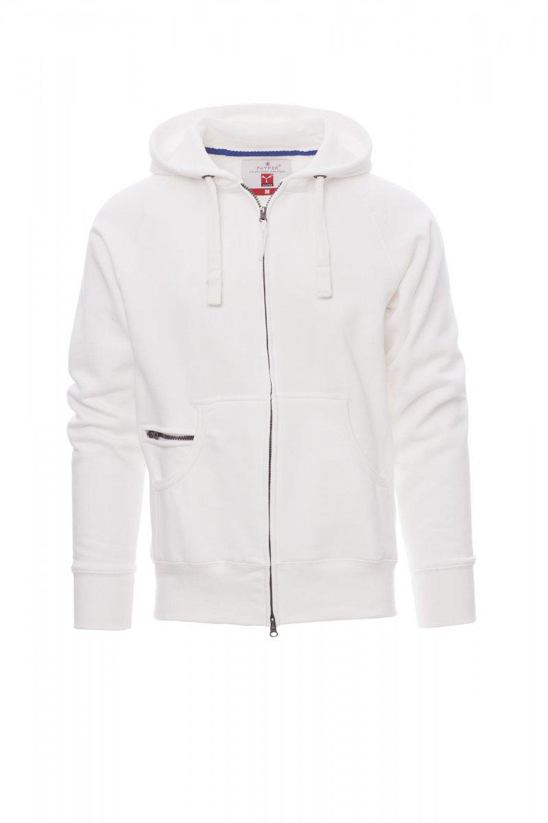 MELEGÍTŐFELSŐK_FULL ZIP CON CAPPUCCIO_Férfi kapucnis melegítő teljes hosszúságú, műanyagborítású SBS cipzárral, dupla fémhúzókával, kapucni dupla varratokkal és fehér állítózsinór, kontrasztos varrással és fémgyűrűkkel, raglán ujjak, kenguruzsebek, kis cipzáras zseb, sztreccsanyagból készült, bordázott mandzsettával és szegéllyel, megerősített varratokkal.