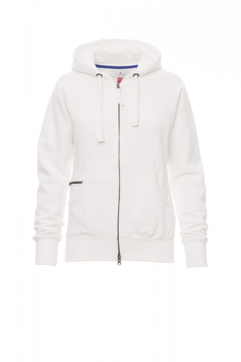 MELEGÍTŐFELSŐK_FULL ZIP CON CAPPUCCIO_Női karcsúsított kapucnis melegítő teljes hosszúságú, műanyagborítású SBS cipzárral, dupla fémhúzókával, kapucni dupla varratokkal és fehér állítózsinór, kontrasztos varrással és fémgyűrűkkel, raglán ujjak, kenguruzsebek, kis cipzáras zseb, sztreccsanyagból készült, bordázott mandzsettával és szegéllyel, megerősített varratokkal.