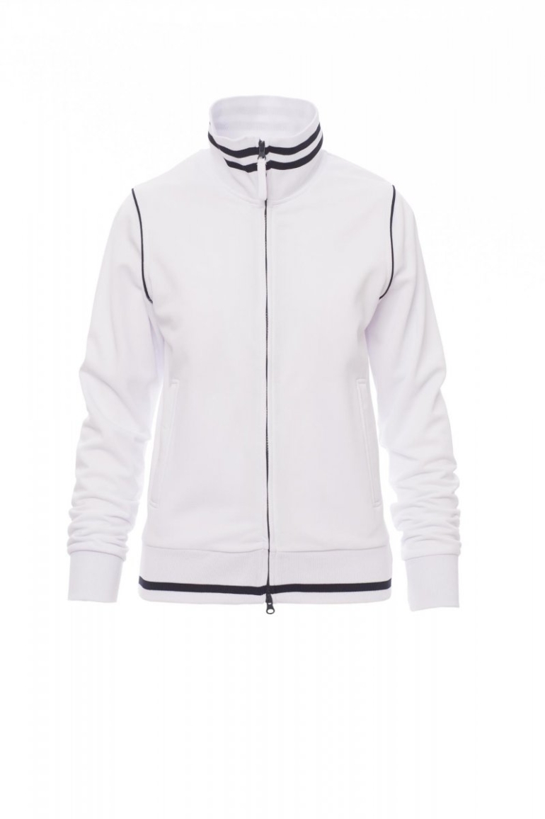 MELEGÍTŐFELSŐK_FULL ZIP_Női karcsúsított melegítő, teljes hosszúságú, kontrasztos színű, műanyagborítású cipzár dupla fémhúzókával. Bordázott gallér és szegély kontrasztos színben, sztreccsanyagból készült, bordázott mandzsetta, zsinórral szegélyezett mandzsetta, két cipzáras zseb, megerősített varratok, piké típusú anyag a jobb légáteresztés érdekében.