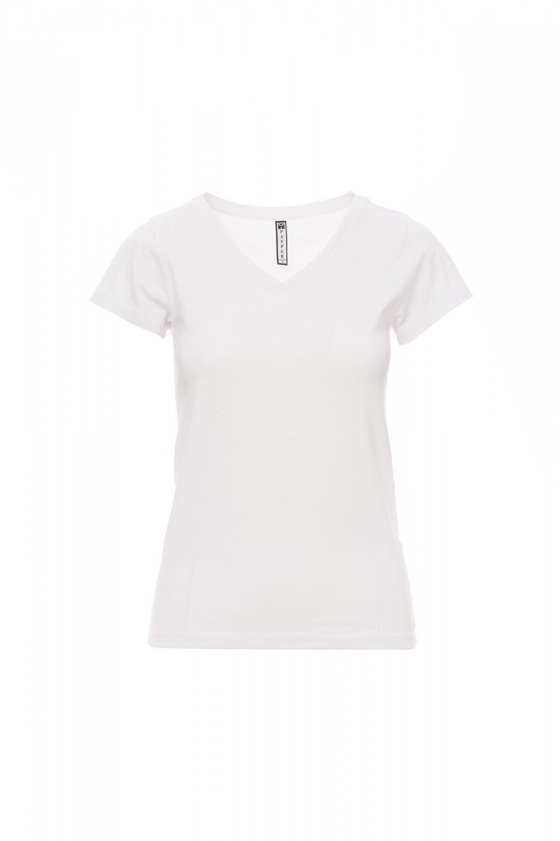 PÓLÓK_RÖVID UJJÚ_Rövid ujjú karcsúsított női póló nagy V-kivágással, alul 1,2 cm-en kevert szálas spandex, rövid, szűk ujj és oldalsó varrás a jobb illeszkedés érdekében, dupla varrás a vállon, és a nyak hátsó részén pamutszalag erősítés.
