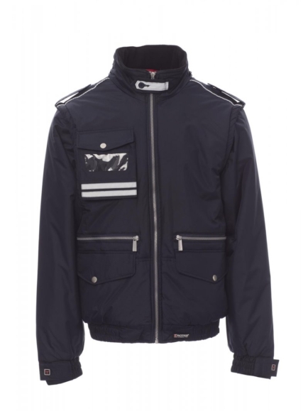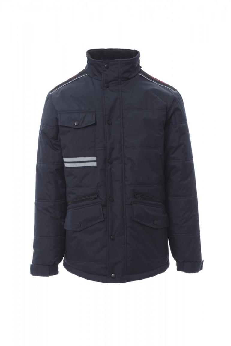 DZSEKIK_IMBOTTITO LUNGHEZZA 3/4_Háromnegyedes férfi kabát, 8 mm-es műanyag cipzár fém húzókával, hajtókával, és műanyag gombokkal, formázott hátsó rész, gallérba rejthető kapucni, két LOCK SYSTEM külső zseb, két cipzáras zseb, a zsebek ferdék a könnyebb hozzáférés érdekében, egy okostelefonzseb a mellkason, jelvénytartó karika, fényvisszaverő csíkok a zseben és a hátrészen. A belseje bélelt, gyapjúbélés a hát- és a gallérrészen, egy zseb, belső cipzár az egyszerűbb nyomtatás és hímzés érdekében.