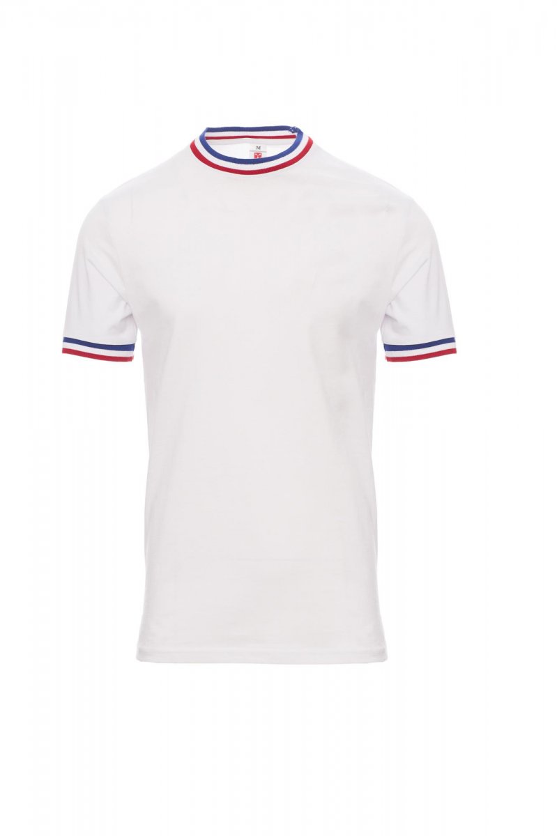 PÓLÓK_RÖVID UJJÚ_Férfi rövid ujjú, környakú póló kontrasztos színű gallérral és ujjszegéllyel (a zászló színei), 2,3 cm-es spandex kevertszálas bordázott nyakrésszel, felső szegéssel elöl, válltól vállig érő anyagerősítéssel. Sztreccsvarratokkal, oldalvarratokkal
