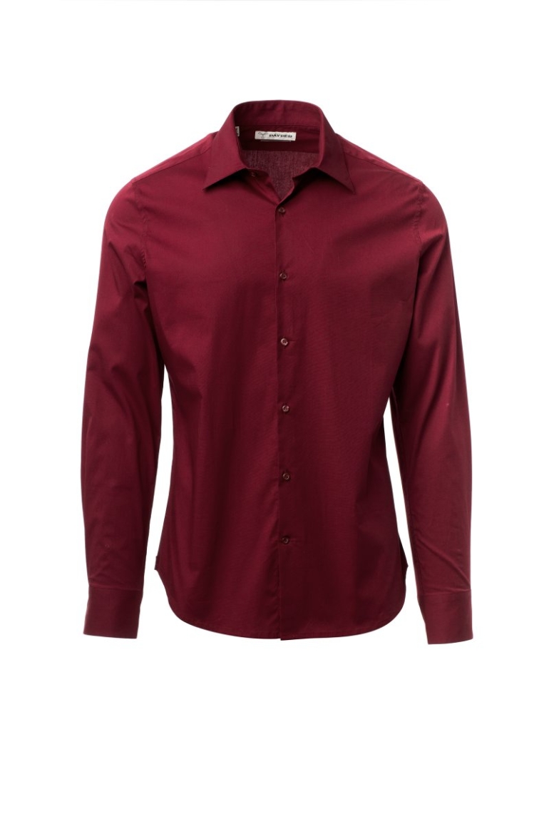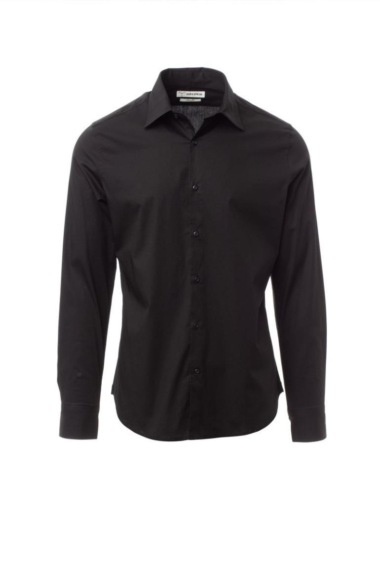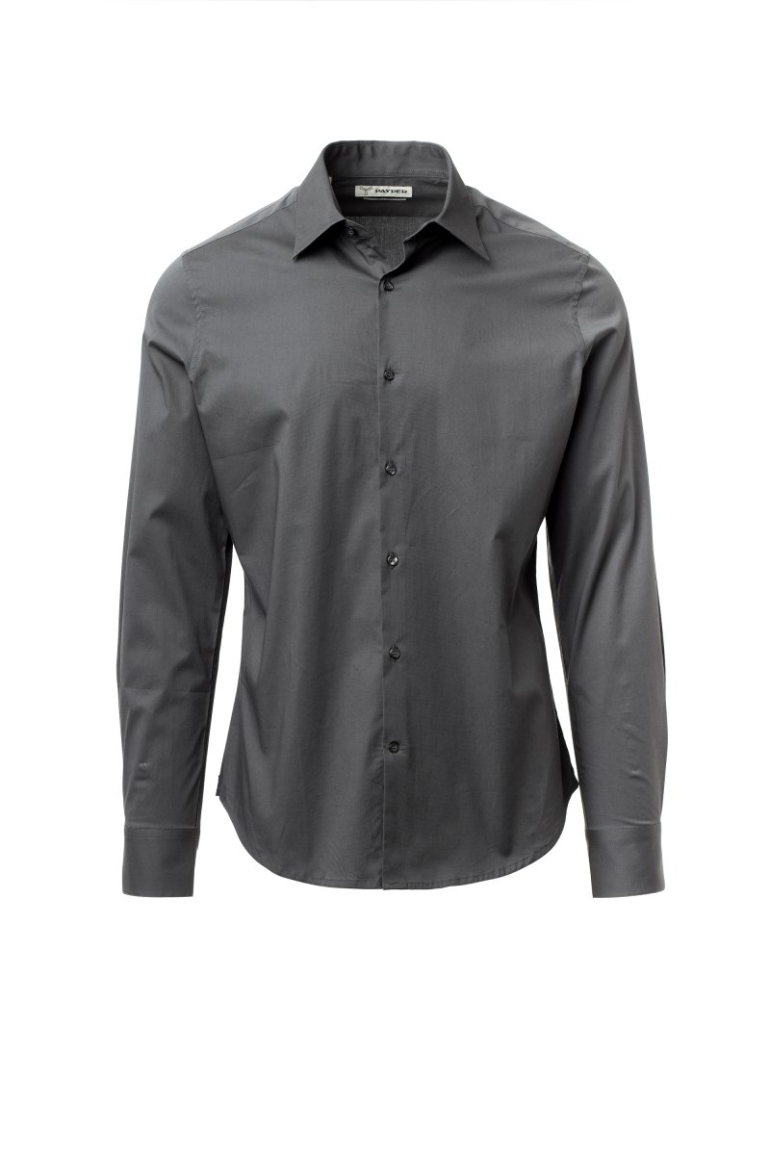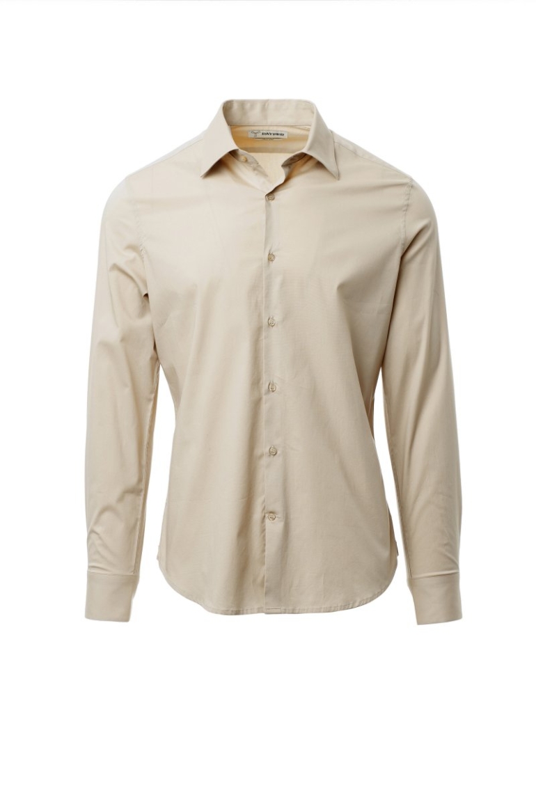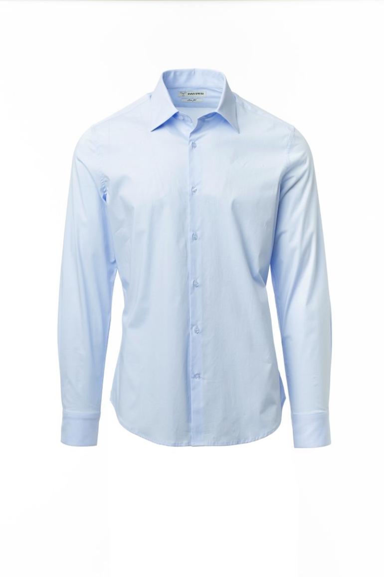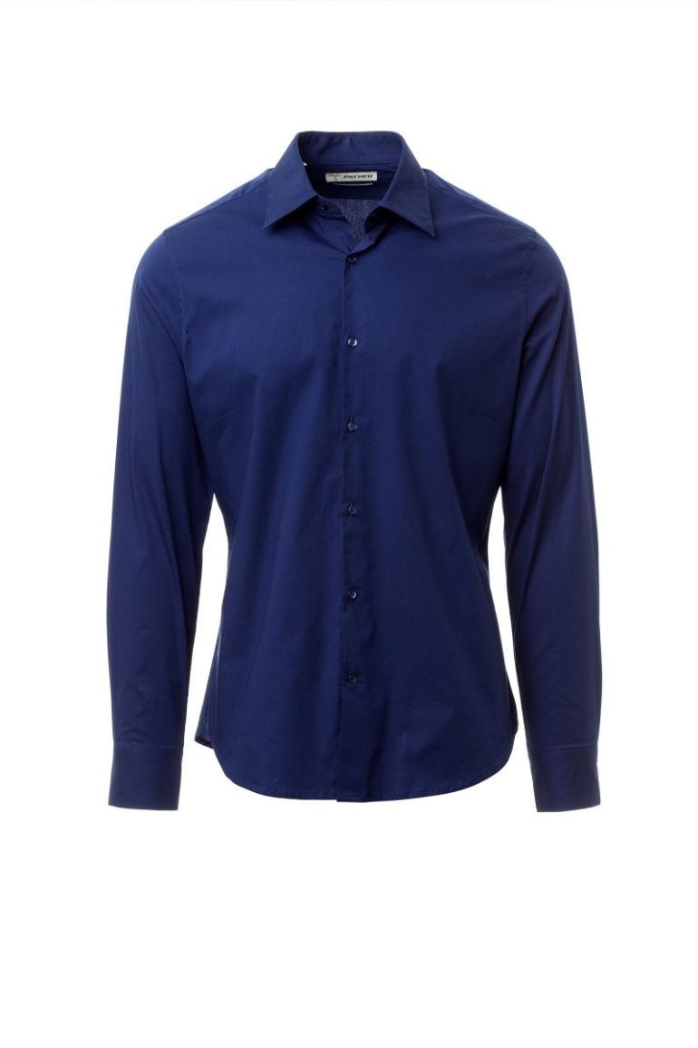 Férfi ing, karcsúsított szabás. Formázott, zárt olasz gallér kivehető merevítőkkel. Behajtott belső gomboláspánt, látható gombolás. Gyöngyház hatású gombok. Hátul sima ingplasztrom. A hát közepén berakás. Oldalt erősítő szövetháromszögek. Lekerekített mandzsetta 2 gombbal.