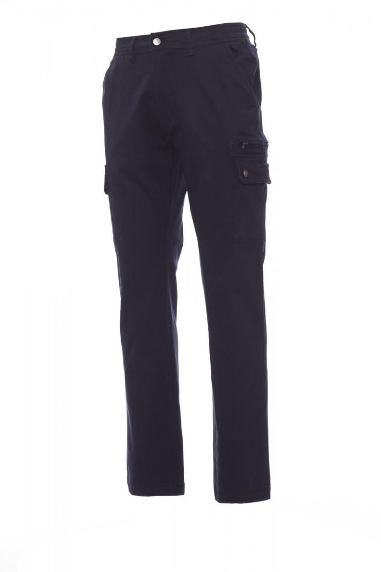 NADRÁGOK_CARGO_Férfi sztreccsnadrág minden évszakra, elasztikus oldalsó résszel és övbújtatókkal, cipzár és fémgomb, két klasszikus szabású első zseb, két oldalsó zseb hajtókával és patentokkal, a bal oldalon biztonsági cipzáras zseb, a jobb oldalon visszahúzható mérőszalag zseb. Két zseb szegéllyel, gombbal és gomblyukkal.