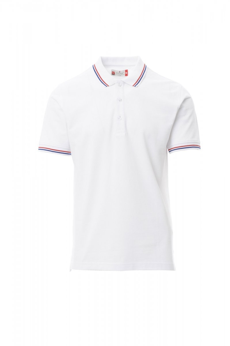PÓLÓING_RÖVID UJJÚ_Uniszex rövid ujjú pólóing 3 fehér gombbal, kontrasztos színű gallérral és ujjal (a zászló színei), bordázott gallér és ujjszegély, oldalsó szellőzők megerősített varratokkal, bújtatott varrás a gallérnál, oldalsó anyagerősítés, sztreccs varratok, anyagerősítés a nyakrész belső oldalán.
