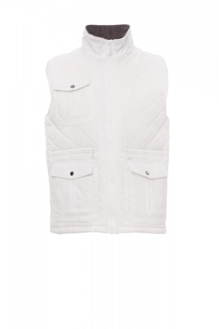 MELLÉNYEK_IMBOTTITO SENZA MANICHE_Férfi steppelt mellény, 8 mm-es műanyag cipzárral és fémhúzókával, gombos oldalsó szellőzőkkel, öt külső zsebbel, kettő LOCK SYSTEM rendszerrel. Párnázott, kordbársonyból készült bordázott belső gallér, egy belső zseb.