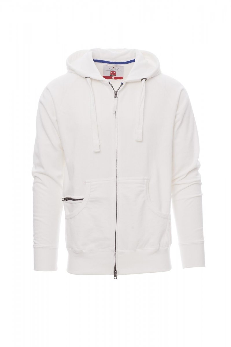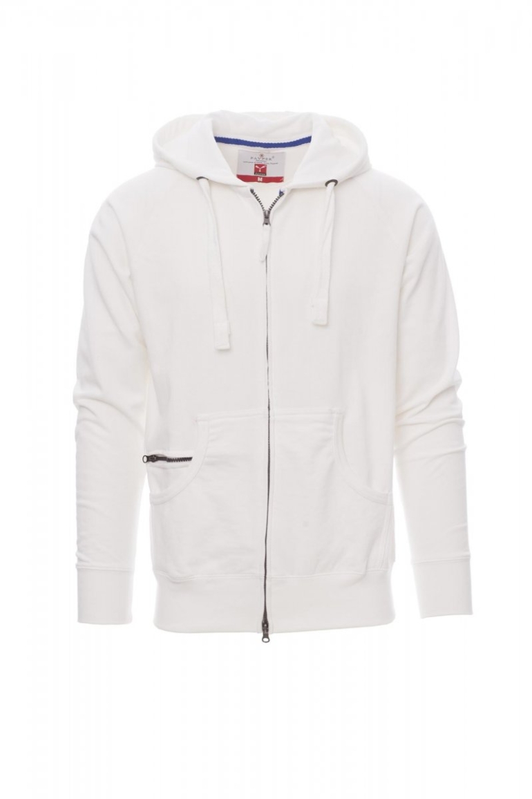 MELEGÍTŐFELSŐK_FULL ZIP CON CAPPUCCIO_Férfi kapucnis melegítő teljes hosszúságú, fedett SBS cipzárral, dupla fémhúzókával, kapucni dupla varratokkal és fehér állítózsinór, kontrasztos varrással és fémgyűrűkkel, raglán ujjak, kenguruzsebek, kis cipzáras zseb, sztreccs anyagból készült, bordázott mandzsettával és szegéllyel, megerősített varratokkal.