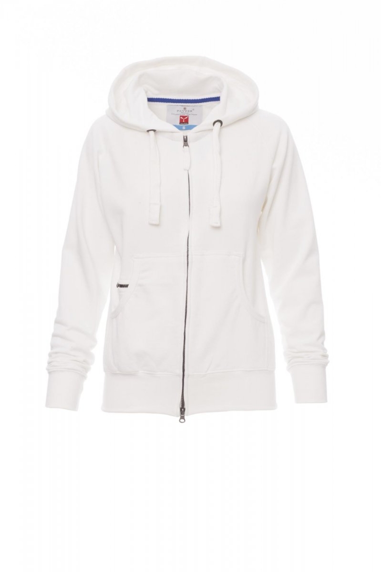 MELEGÍTŐFELSŐK_FULL ZIP CON CAPPUCCIO_Női, karcsúsított, kapucnis melegítő teljes hosszúságú, fedett SBS cipzárral, dupla fémhúzókával, kapucni dupla varratokkal és fehér állítózsinór, kontrasztos varrással és fémgyűrűkkel, raglán ujjak, kenguruzsebek, kis cipzáras zseb, sztreccsanyagból készült, bordázott mandzsettával és szegéllyel, megerősített varratokkal.