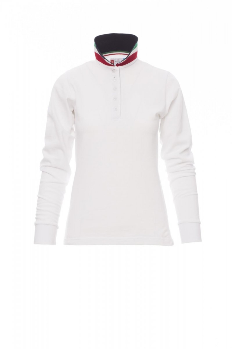 PÓLÓING_HOSSZÚ UJJÚ_Női hosszú ujjú, karcsúsított pólóing 5, színben illeszkedő, gyöngyházhatású gombbal, színben illő gallérral, kontrasztos színű alsórésszel (a zászló színei). A zászló színeit mutató hajtóka a gomb felett és oldalsó szellőzők, bordázott gallér és mandzsetta, bújtatott varrás a gallérnál, oldalsó anyagerősítés.