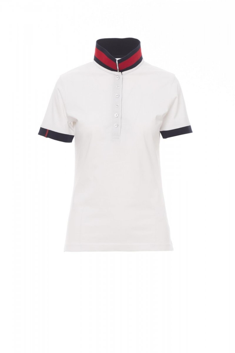 PÓLÓING_RÖVID UJJÚ_Női rövid ujjú, karcsúsított pólóing 6, színben illeszkedő, gyöngyházhatású gombbal, színben illő gallérral kontrasztos színű alsórésszel. Kontrasztos színű oldalsó szellőzők és hajtóka a gombok fölött, jobb ujj szegélye színes díszítéssel (a gallérral azonos szín), bordázott ujjszegély, bújtatott varrás a gallérnál kontrasztos színű anyagerősítéssel, oldalsó anyagerősítés, anyagerősítés a nyakrész belső oldalán.