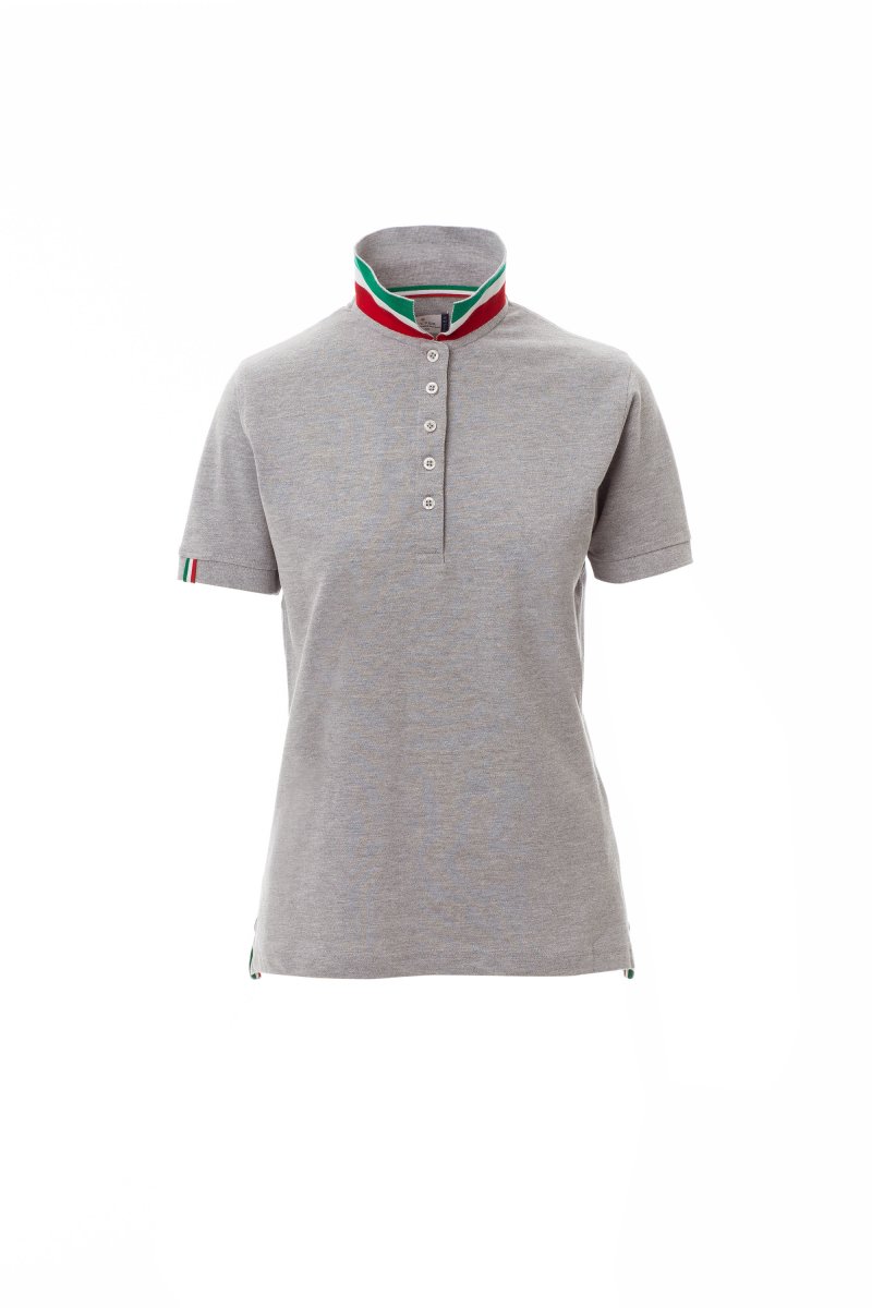 PÓLÓING_RÖVID UJJÚ_Női rövid ujjú, karcsúsított pólóing 5, színben illeszkedő, gyöngyházhatású gombbal, színben illő gallérral kontrasztos színű alsórésszel (a zászló színei). Jobb ujj szegélye színes díszítéssel (a gallérral azonos szín), bordázott gallér és ujjszegély, oldalsó szellőző díszítés a zászló színeiben, bújtatott varrás a gallérnál dzsörzé anyagszalaggal (a zászló színei), oldalsó anyagerősítés, anyagerősítés a nyakrész belső oldalán