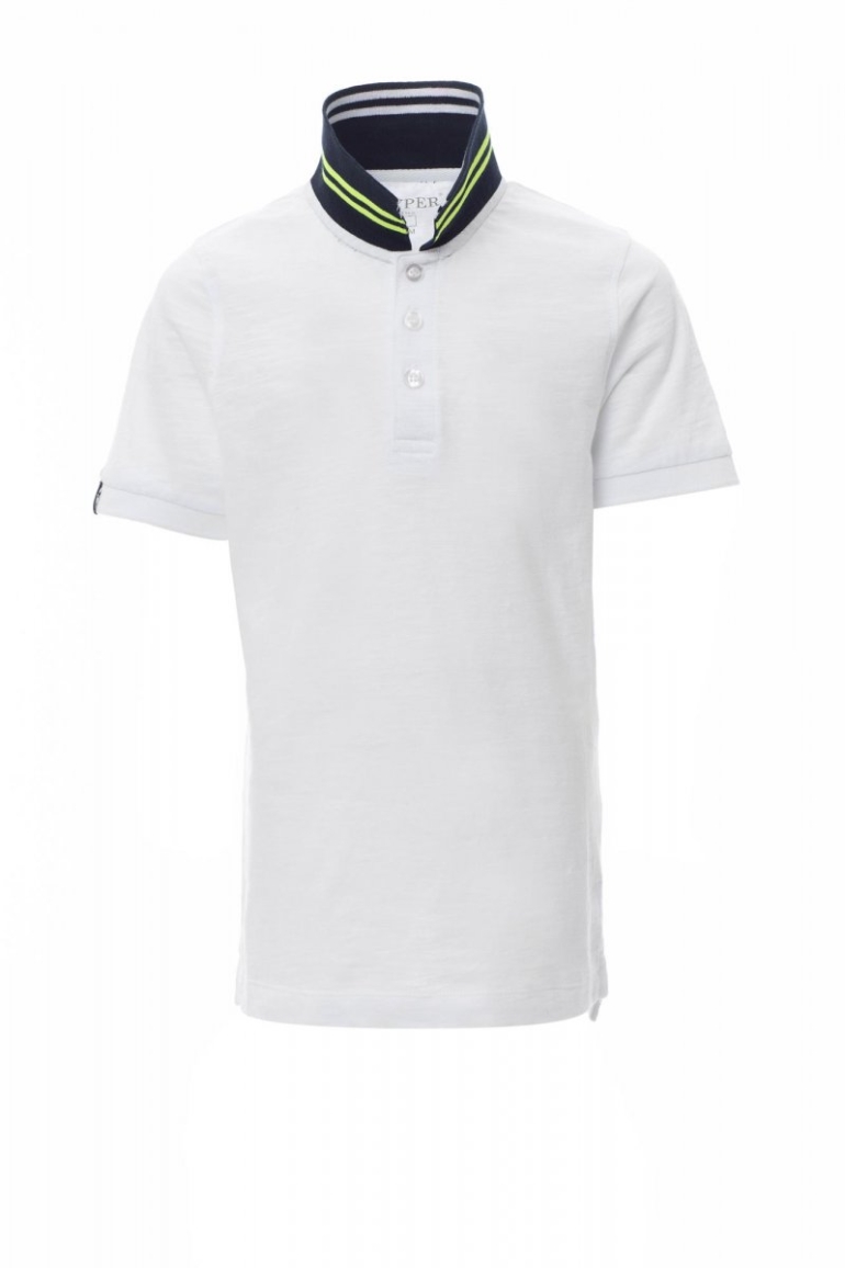 PÓLÓING_RÖVID UJJÚ_Gyermek rövid ujjú pólóing 3, színben illeszkedő, gyöngyházhatású gombbal, galléron kontrasztos színű csíkok, alján pedig fluoreszkáló csíkok, bordázott gallér és ujjszegély, jobb ujjon díszítés, oldalsó szellőzők és bújtatott varrás a gallérnál fluoreszkáló anyagerősítéssel, transzfernyomásos címke.