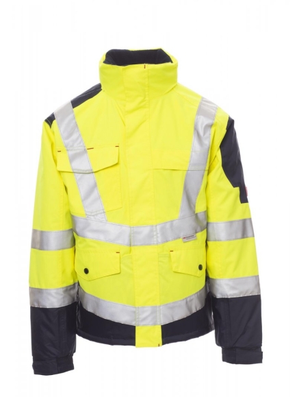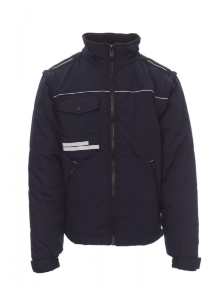 DZSEKIK_IMBOTTITO_Férfi kabát kontrasztos színű, műanyagborítású cipzárral és fémhúzókával, sztreccsanyagból készült, bordázott mandzsettával és derékkal, két külső zsebbel és bújtatott cipzárakkal. Belső: bélelt, mikroszálas gyapjúgallér és hátsórész, egy cipzáras okostelefonzseb kábel számára nyílással, cipzár a vállakon és a mellkason az egyszerűbb nyomtatás és hímzés érdekében.