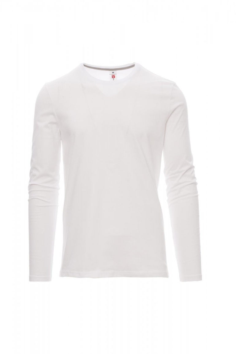 PÓLÓK_HOSSZÚ UJJÚ_Férfi hosszú ujjú, környakú póló 1,5 cm-es spandex kevertszálas bordázott nyakrésszel, felső szegéssel elöl, a nyakrész belső oldalán látható kontrasztos színű, válltól vállig érő anyagerősítéssel, sztreccsvarratok, oldalvarratok