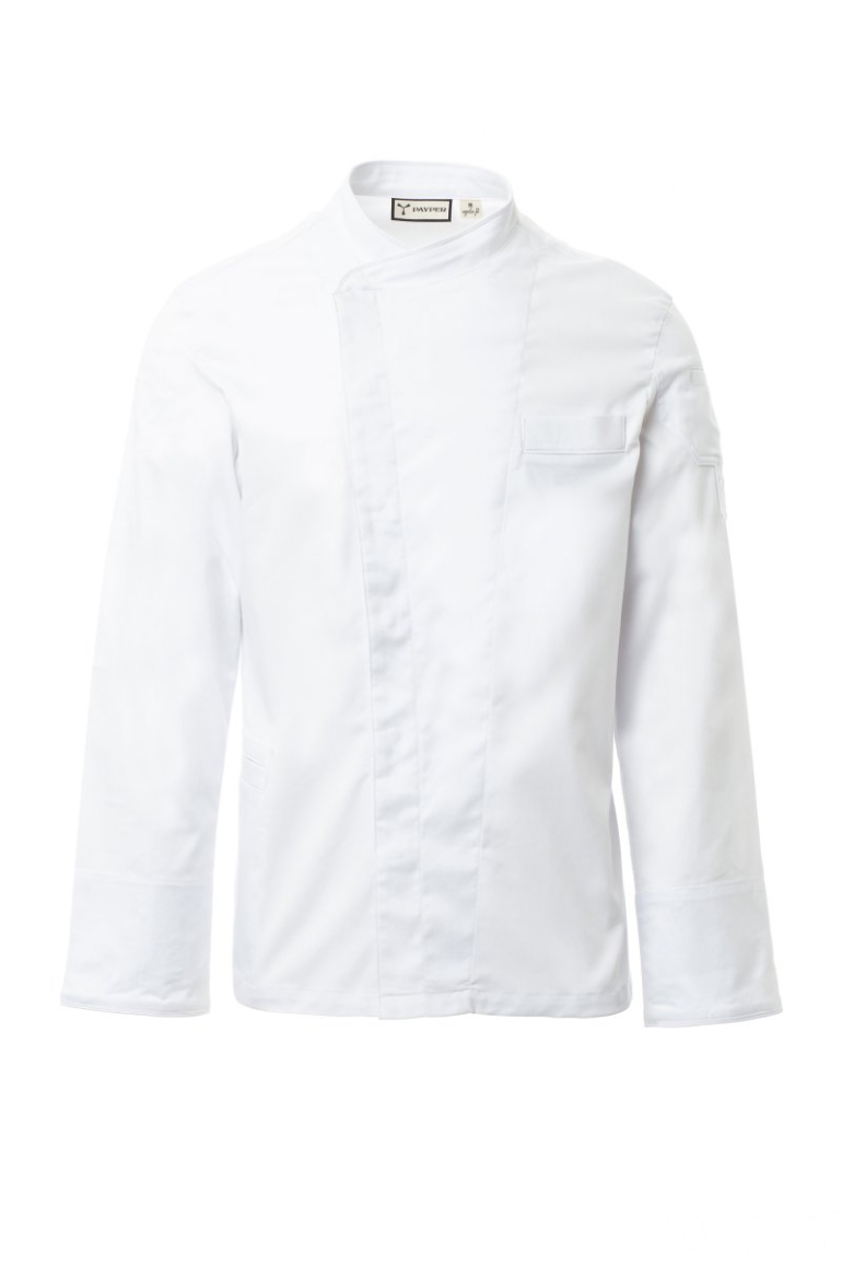 SÉFKABÁTOK_MANICA LUNGA_Szakácskabát mandarin gallérral, pamut twill és Lycra® T400® anyagból, kiváló rugalmas és légáteresztő tulajdonságokkal. Dupla soros záródás pattintható gombokkal. Hosszú ujjú felhajtható mandzsetta, félkör alakú hálós rész a karnyílás alatt, a légáteresztés érdekében. Ikonikus formájú folt a bal vállon, tónusos hímzéssel, tollzsebekkel kiegészítve. Mellkaszseb és praktikus okostelefon zseb a derekán. Színes körvonal a nyakon, az ujj alsó részén és a mellkaszseben. Függőleges hasítékok a hát alsó részén a mozgás megkönnyítése érdekében.