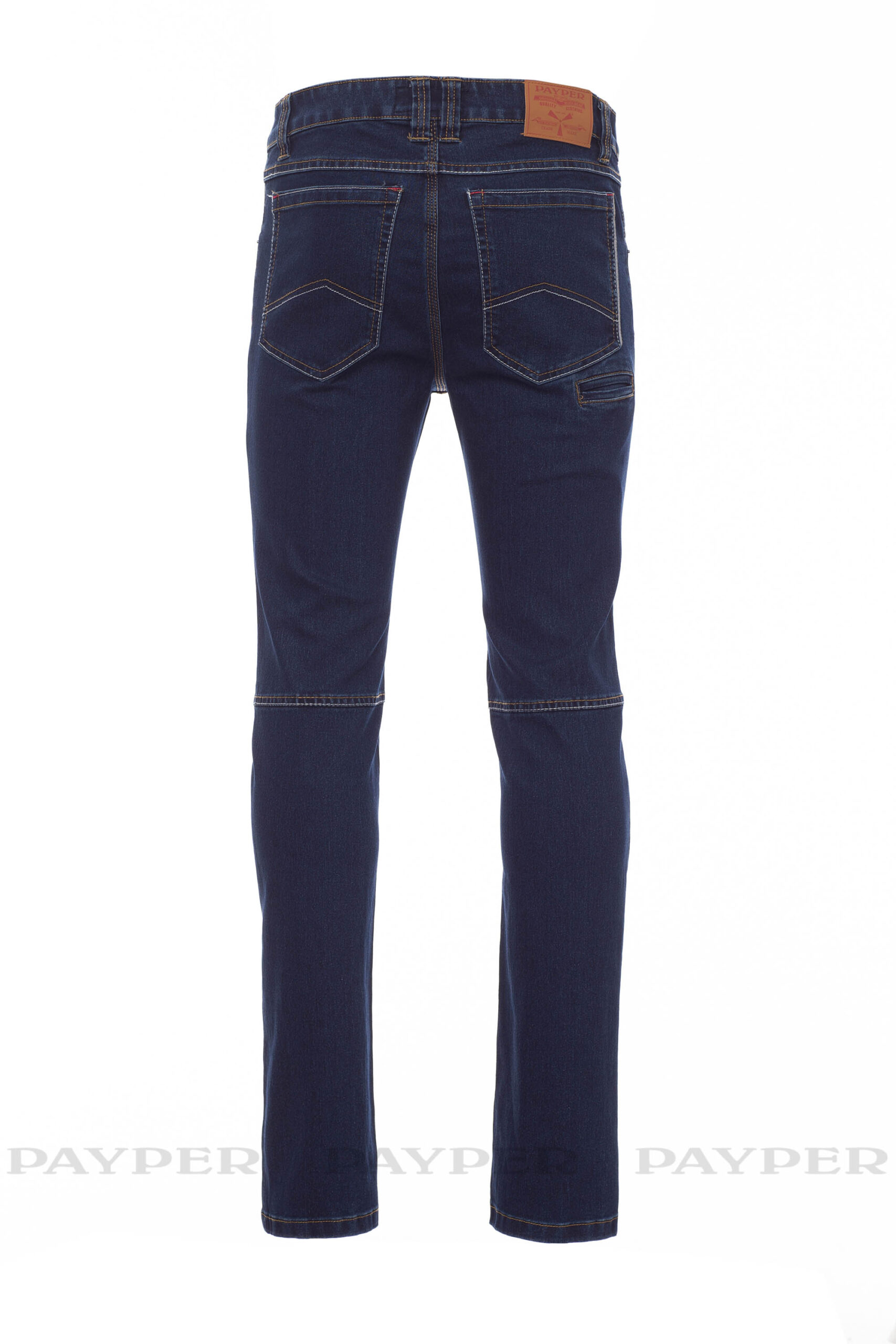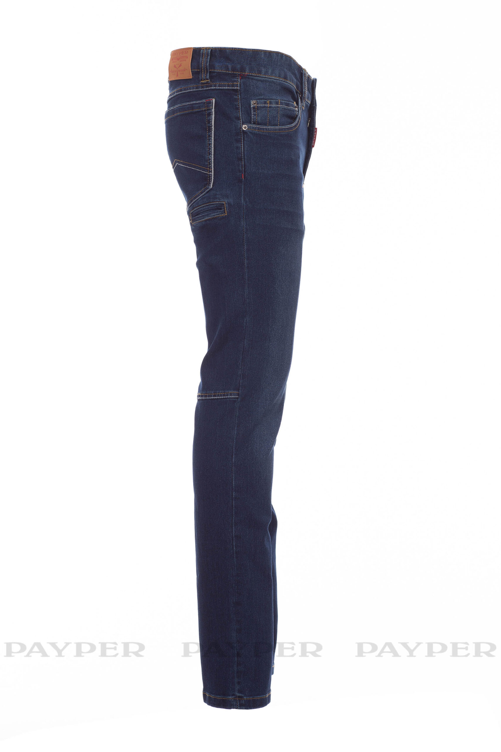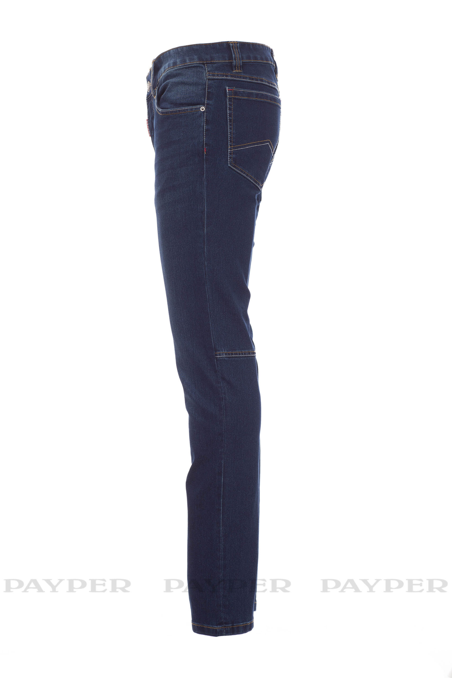 Farmerszabású férfi nadrág öt zsebbel, 1 behúzható mérőszalag zseb, 1 toll- és sniccertartó zseb, fémcipzár és -gomb, övbújtatók, kőmosott. Kopott és fakó hatású, egyenes szárú, a szárak belsején kontrasztos varrás vastag cérnával és tripla varrat a belső lábszáron. Anyag tömege: 10,50oz/yd².