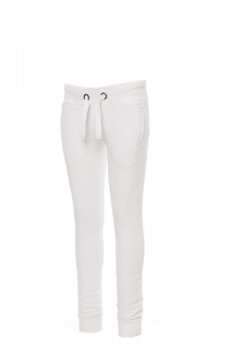 MELEGÍTŐ NADRÁGOK_SPORTIVO_Női melegítőnadrág sztreccsanyagból készült, bordázott derékrésszel és lábszárrésszel, fehér állítózsinór kontrasztos színű varrással és fémgyűrűkkel, két elülső bordázott zseb és megerősített varratokkal.