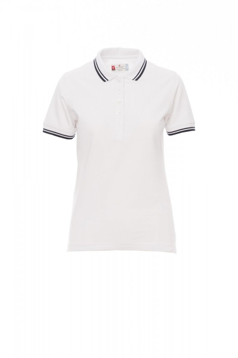 PÓLÓING_RÖVID UJJÚ_Női rövid ujjú, karcsúsított pólóing 5 fehér gombbal, enyhén kontrasztos díszítéssel ellátott gallérral és ujjal, bordázott gallér és ujjszegély, oldalsó szellőzők megerősített varratokkal, bújtatott varrás a gallérnál, oldalsó anyagerősítés, sztreccsvarratok, anyagerősítés a nyakrész belső oldalán.