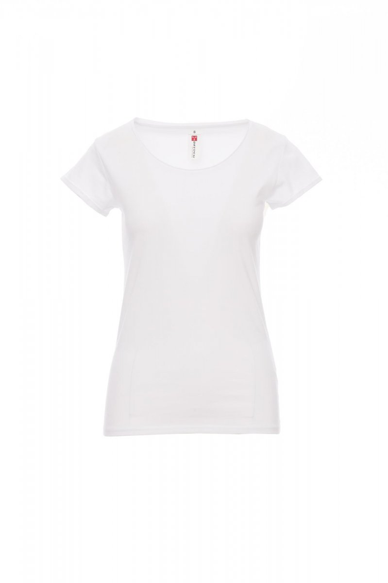 PÓLÓK_RÖVID UJJÚ_Karcsúsított női rövid ujjú póló durva kidolgozású, 1,0 cm-es széles nyakivágással, vállak duplán szegett varratokkal a belső részen, nyers eldolgozású vékony felhajtások az ujjaknál, oldalvarratok.