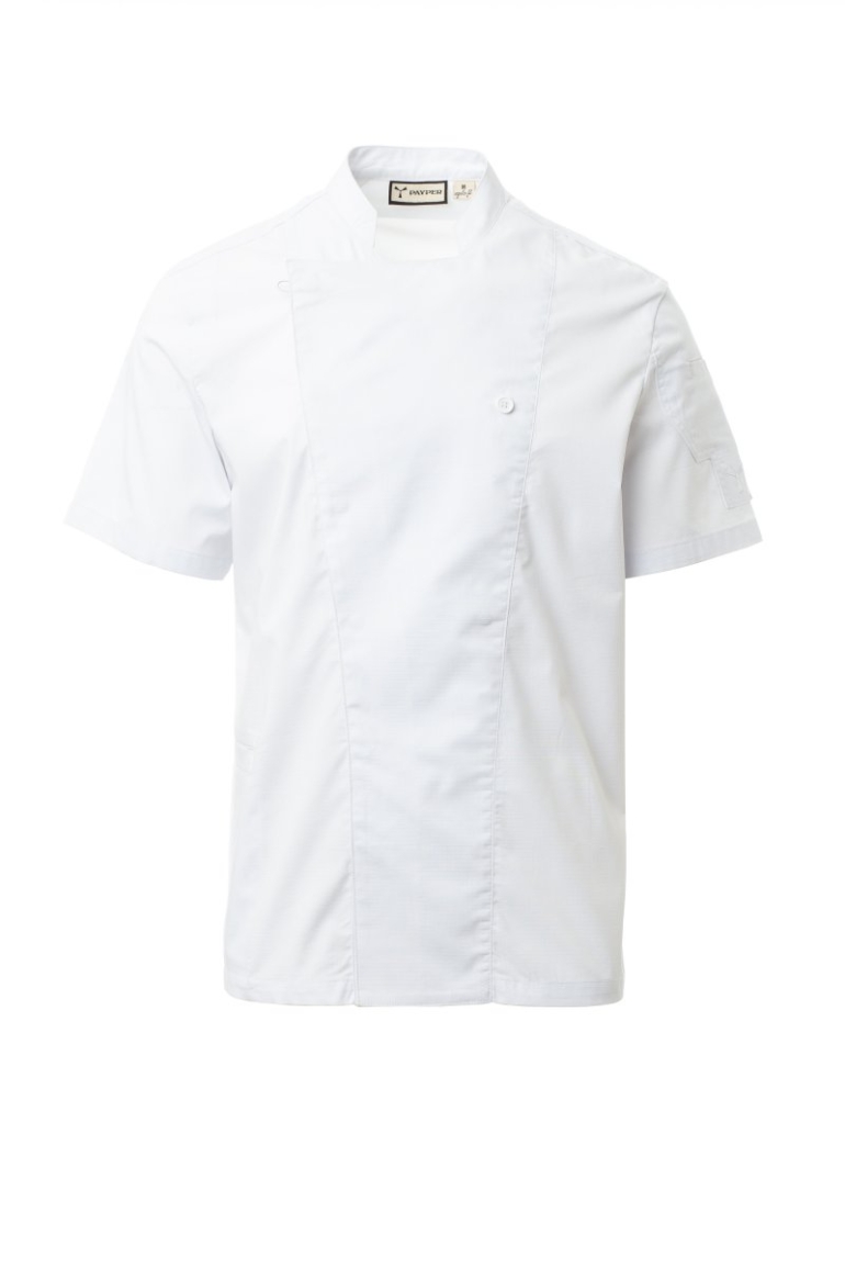 SÉFKABÁTOK_MANICA CORTA_Szakácskabát mandarin gallérral, pamut twill és Lycra® T400® anyagból, kiváló rugalmas és légáteresztő tulajdonságokkal és kényelmes hálós anyaggal a háton és a hónalj alatt, hogy fokozza a légáteresztő képességet. Dupla soros záródás pattintható gombokkal, kihajtható szárny, mely egy szabadon álló gomb rögzítésével a mellkasra rögzíthető, mely a személyre szabott hajtóka és az innovatív V-nyak hatását kelti. Hosszú ujjú, látható, patentgombbal zárható mandzsettával. Ikonikus formájú folt a bal vállon, tónusos hímzéssel, tollzsebekkel kiegészítve. Praktikus okostelefon zseb a derekán.