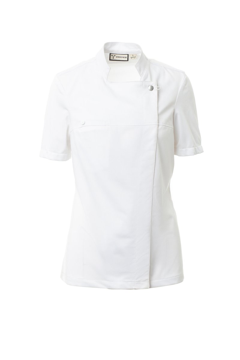 SÉFKABÁTOK_MANICA CORTA_Szakácskabát mandarin gallérral, pamut twill és Lycra® T400® anyagból, kiváló rugalmas és légáteresztő tulajdonságokkal és kényelmes hálós anyaggal a háton, a mandzsettánál és a deréknál, hogy fokozza a légáteresztő képességet. Dupla soros záródás pattintható gombokkal, kihajtható szárny, mely egy szabadon álló gomb rögzítésével a mellkasra rögzíthető, mely a személyre szabott hajtóka és az innovatív V-nyak hatását kelti. Rövid ujjú, szegéllyel.