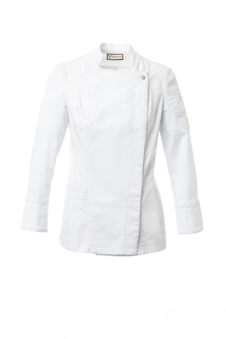 SÉFKABÁTOK_MANICA LUNGA_Szakácskabát mandarin gallérral, pamut twill és Lycra® T400® anyagból, kiváló rugalmas és légáteresztő tulajdonságokkal. Dupla soros záródás pattintható gombokkal, kihajtható szárny, mely egy szabadon álló gomb rögzítésével a mellkasra rögzíthető, mely a személyre szabott hajtóka és az innovatív V-nyak hatását kelti. Hosszú ujjú, látható, patentgombbal zárható mandzsettával. Ikonikus formájú folt a bal vállon, tónusos hímzéssel, tollzsebekkel kiegészítve. Praktikus okostelefon zseb a derekán. Függőleges hasítékok a hát alsó részén a mozgás megkönnyítése érdekében.