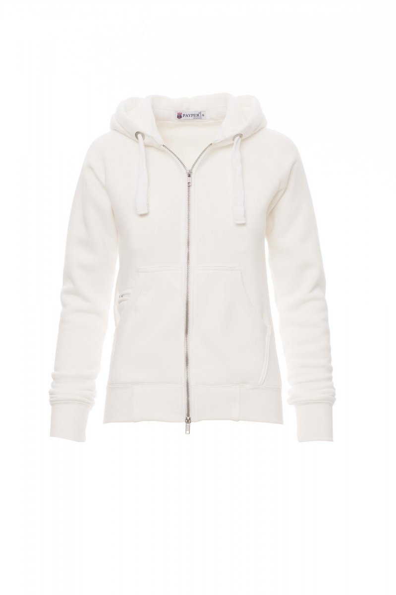 MELEGÍTŐFELSŐK_FULL ZIP CON CAPPUCCIO_Karcsúsított női kapucnis melegítő teljes hosszúságú, kétoldalas, fémcipzárral, fehér állítózsinór kontrasztos színű varrással és fémgyűrűkkel, kenguruzsebek, cipzáras kis zseb nyílással mp3-lejátszó/mobiltelefon kábelének, sztreccsanyagból készült, bordázott mandzsettával és szegéllyel, megerősített varratokkal. Többárnyalatú fehér hatás (Bordeaux esetén fekete).