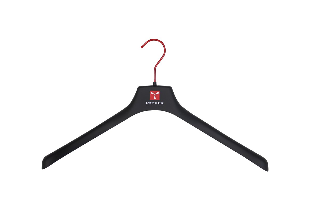 ÉRTÉKESÍTÉS_AKASZTÓK_Vállfa a jobb illeszkedés érdekében a vállrészen kiszélesedéssel, nyomtatott logóval ellátott lapos nyakrésszel, enyhén csúszásgátló, soft-touch gumírozással.