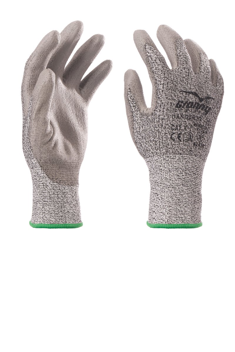 VÁGÁSÁLLÓ KESZTYŰK_LÉGÁTERESZTŐ HÁTSÓ RÉSZ KÖTÖTT CSUKLÓRÉSSZEL_Vágásálló kesztyű 13G polietilénből, szellőző kézfej, kötött mandzsetta, poliuretán bevonat. Jellemzők: masszív. Erősségek: vágásállóság, kényelem, jó fogás, érzékenység, precizitás. Alkalmazási területek: éles peremű, száraz vagy enyhén olajos tárgyak kezelése vagy összeszerelése. Legkisebb értékesíthető mennyiség: 1 tucat (12 pár). A szegély mérettől függően eltérő színű.