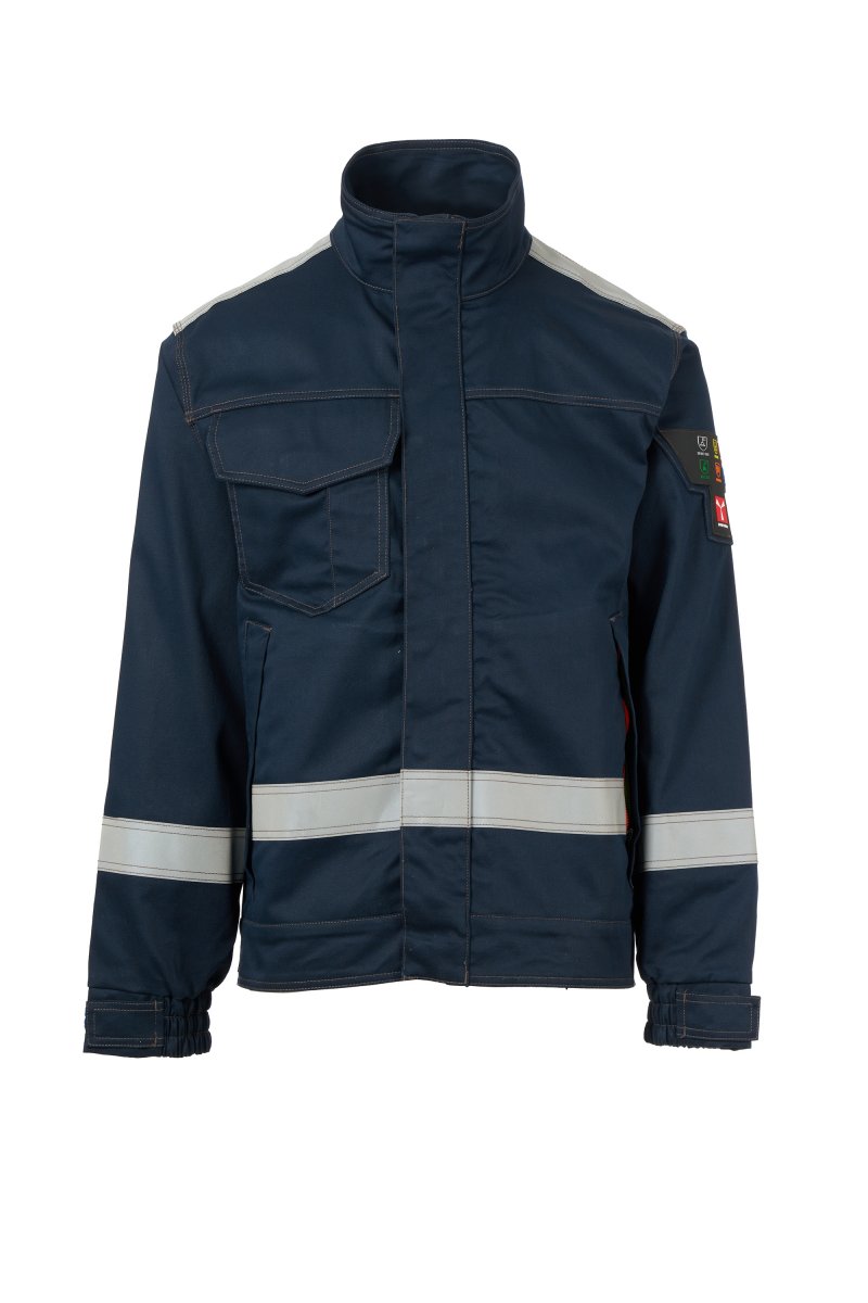 DZSEKIK_NO IMBOTTITO_Béleletlen kabát, antisztatikus, lángálló anyagból, villamos ív- és vegyszerálló tulajdonságokkal, ideális hegesztők számára. Kontrasztos dupla és tripla varratok lángálló fonalból. Hajtókás, patentos és kéttónusú fém cipzáras záródás, belső tépőzárral és patentokkal. Fényvisszaverő sávok a vállon, a derékon és az ujjakon. Szabott foltzseb a bal karon, tanúsítványösszegző címkével. Jobb mellzseb kivehető jelvénytartóval és tolltartóval, amelyet tépőzáras hajtóka fed. Két elülső zseb rejtett, kétszínű fém cipzárral. Folt a nyak hátsó részén. Hátul formázott alsó rész a jobb védelem érdekében, tépőzárral záródó külső paszománttal állítható. Elasztikus, tépőzáras paszománttal állítható mandzsetta. Minden látható tartozék lángálló. Egyetlen fém kiegészítő sem érintkezik közvetlenül a felhasználó bőrével.