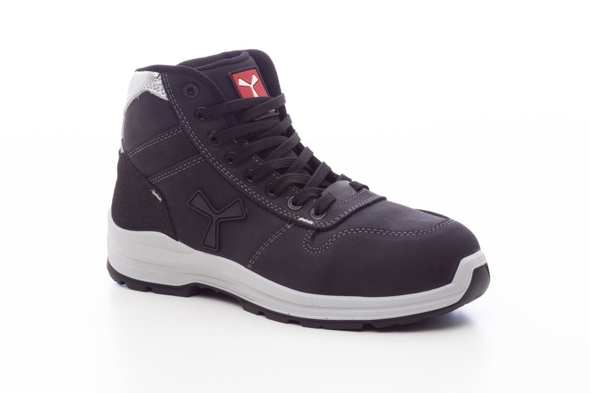 S3 BIZTONSÁGI CIPŐK_MAGASAN FŰZŐDŐ_Közepes szárú antisztatikus női biztonsági cipő, légáteresztő és vízlepergető bőr felsőrésszel, légáteresztő és kopásálló belső béléssel (a teljes belső felületen), 8+8 metalfree (fémmentes) fűzőlyukkal, Pampas bevonattal készült, fényvisszaverő betéttel ellátott sarokvédővel, öntött alumíniumból készült cipőorrvédővel, kivehető Ortholite X40 016 harántemelővel, tanúsítottan átfúródásgátló, textillemezből készült talpbéléssel, kicsavarodásgátló merevítővel, patkó alakú orrbetét-merevítővel, ultrakönnyű, elektrosztatikusan levezető poliuretánból készült köztes cipőtalppal, nagy szakítószilárdságú és kiegyensúlyozott sűrűségű PU poliészterből készült MASTER BALANCE párnázattal, elektrosztatikusan levezető, hőre lágyuló poliuretánból (TPU) készült XTRAIL GRIP talppal, sarokvédővel és orrvédővel ellátva.
