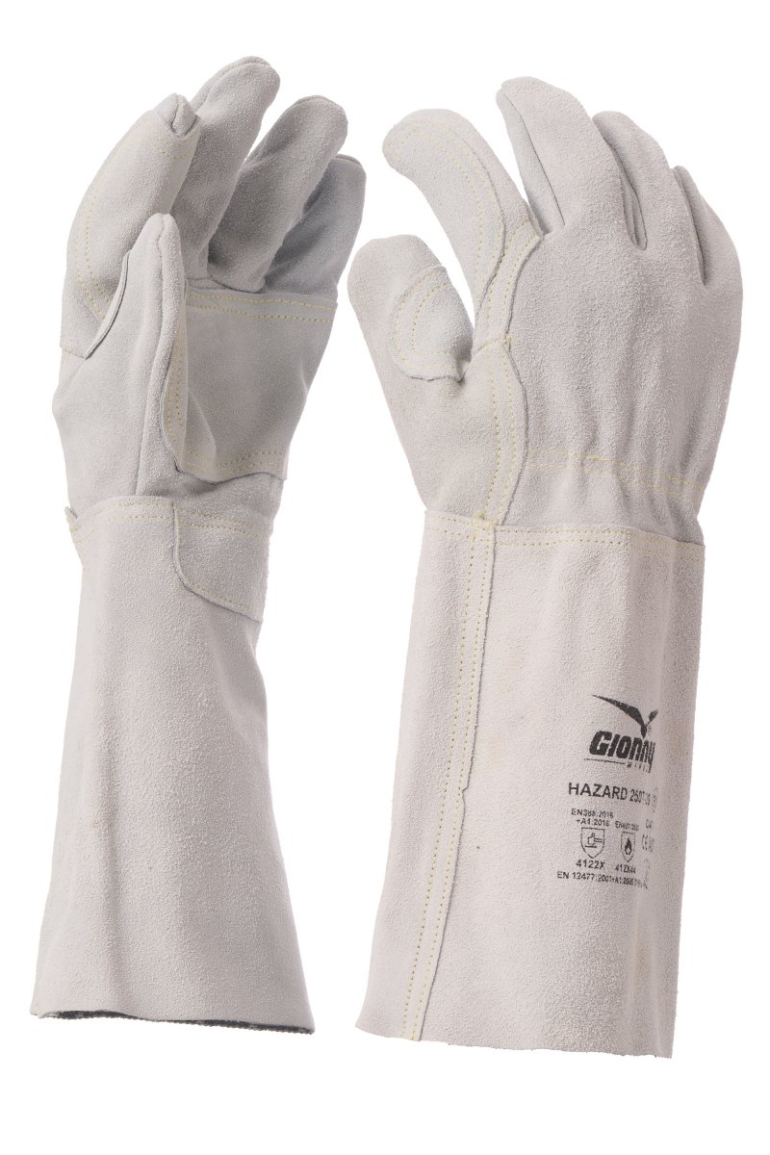 Hegesztőkesztyűk_RINFORZATI FINO ALL’INDICE CON MANICHETTA 20CM_Teljes egészében hasított marhabőrből készült hegesztőkesztyű. Megerősített tenyér, hasított marhabőrből készült hüvelyk- és mutatóujj. Érvédő és 20 cm-es hosszított csuklórész hasított marhabőrből. Elasztikus csuklószorító, amely megakadályozza a kéz kicsúszását a kesztyűből. Varrás para-aramid fonallal. Jellemzők: masszív, nagyon tartós. Erősségek: jó fogás, védelem, könnyen használhatóság. Alkalmazási területek: alkalmas nehéz, szögletes élű, durva, abrazív és forró tárgyak kezeléséhez, hegesztéshez, csiszoláshoz és sorjázáshoz, rendszerek tisztításához, asztalos- és lakatosmunkákhoz, hegesztési munkálatokhoz. Legkisebb értékesíthető mennyiség: 1 tucat (12 pár).