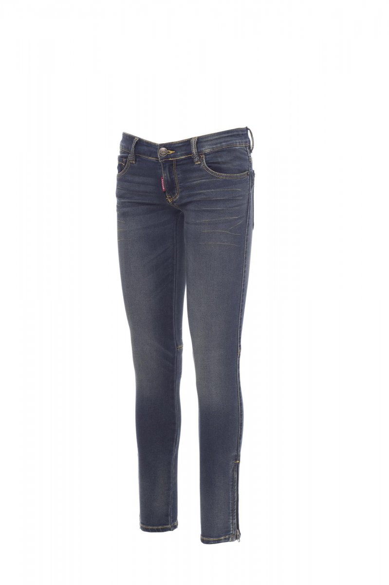 FARMER_5 TASCHE_Négy évszakos női farmer öt zsebbel, derékrészen övvezetőkkel, fémcipzáras rögzítés gombbal, viseltes kinézet, kontrasztos színű, nagy igénybevételhez használatos varratok, dupla szegés a láb belső részén, fokozottan karcsúsított szárak, szár alsó részén cipzár, csapok és foltok valódi bőrből. Anyag tömege: 10,50oz/yd².