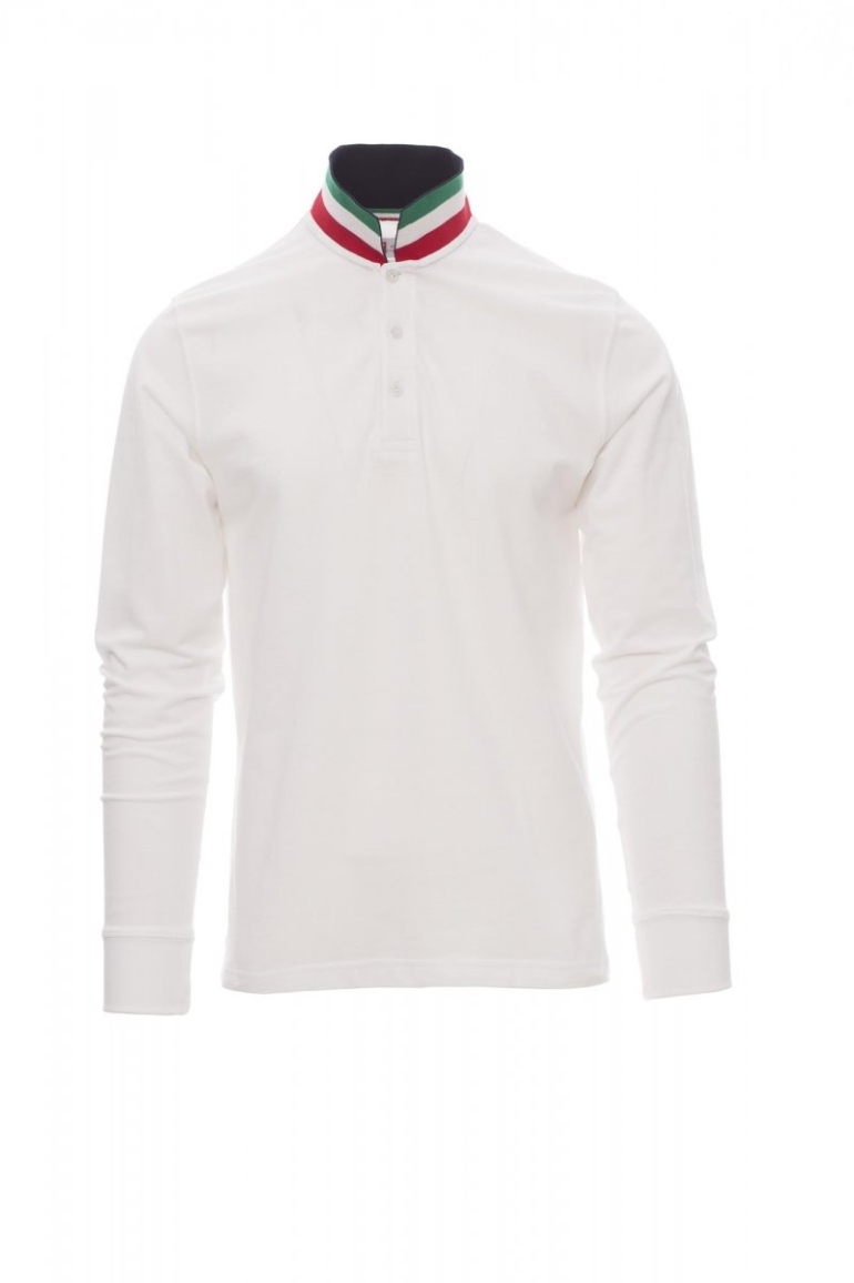 PÓLÓING_HOSSZÚ UJJÚ_Férfi hosszú ujjú pólóing 3, színben illeszkedő, gyöngyházhatású gombbal, színben illő gallérral, kontrasztos színű alsórésszel (a zászló színei). A zászló színeit mutató hajtóka a gomb felett és oldalsó szellőzők, bordázott gallér és ujjszegély, bújtatott varrás a gallérnál, oldalsó anyagerősítés, anyagerősítés a nyakrész belső oldalán.