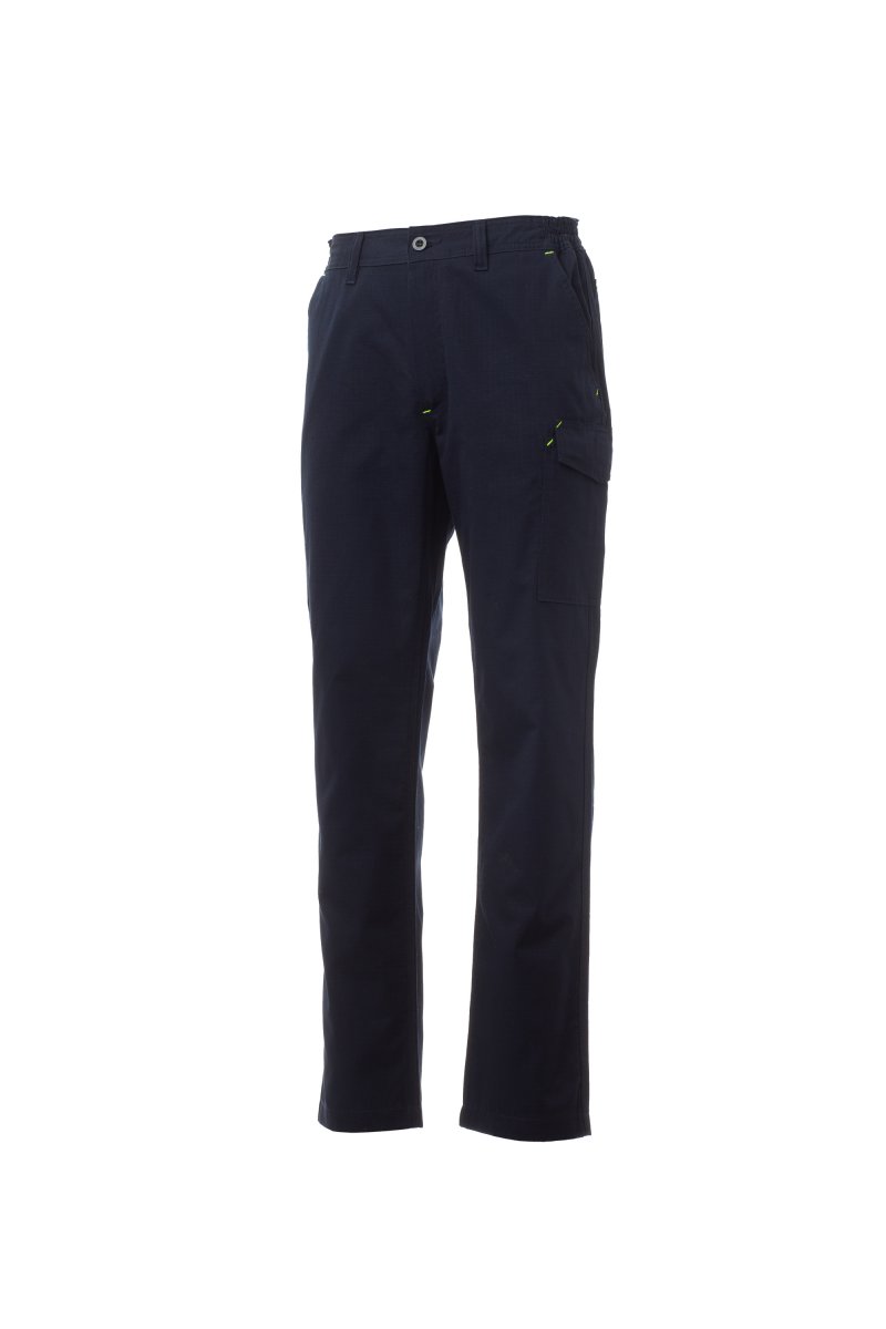 NADRÁGOK_CARGO_Ripstop pamut nyári nadrág, elasztikus övrésszel és a derékrészen övbújtatókkal. Cipzáras és gombos zárás. Klasszikus szabású első zsebek, aprópénztartó zsebecske, a jobb lábon mérőszalagtartó zseb, a bal lábon LOCK SYSTEM rendszerű, hajtókás záródású oldalzseb. Két hátsó zseb, közülük az egyik hajtókával és tépőzárral. Háromtűs varrások.