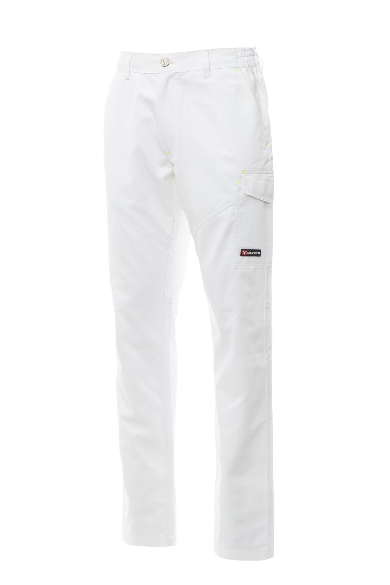 NADRÁGOK_CARGO_Uniszex négy évszakos nadrág rugalmas oldalsó résszel és övbújtatókkal, cipzár és műanyag gomb, két klasszikus szabású első zseb, LOCK SYSTEM oldalzseb, zseb a mérőszalag számára; két zseb a hátsó részen, az egyik hajtókával és tépőzárral, színben megegyező varrással, a hátsó zseben fényvisszaverő sávokkal, tripla varrással. A fehér színű modell esetében farmergomb.