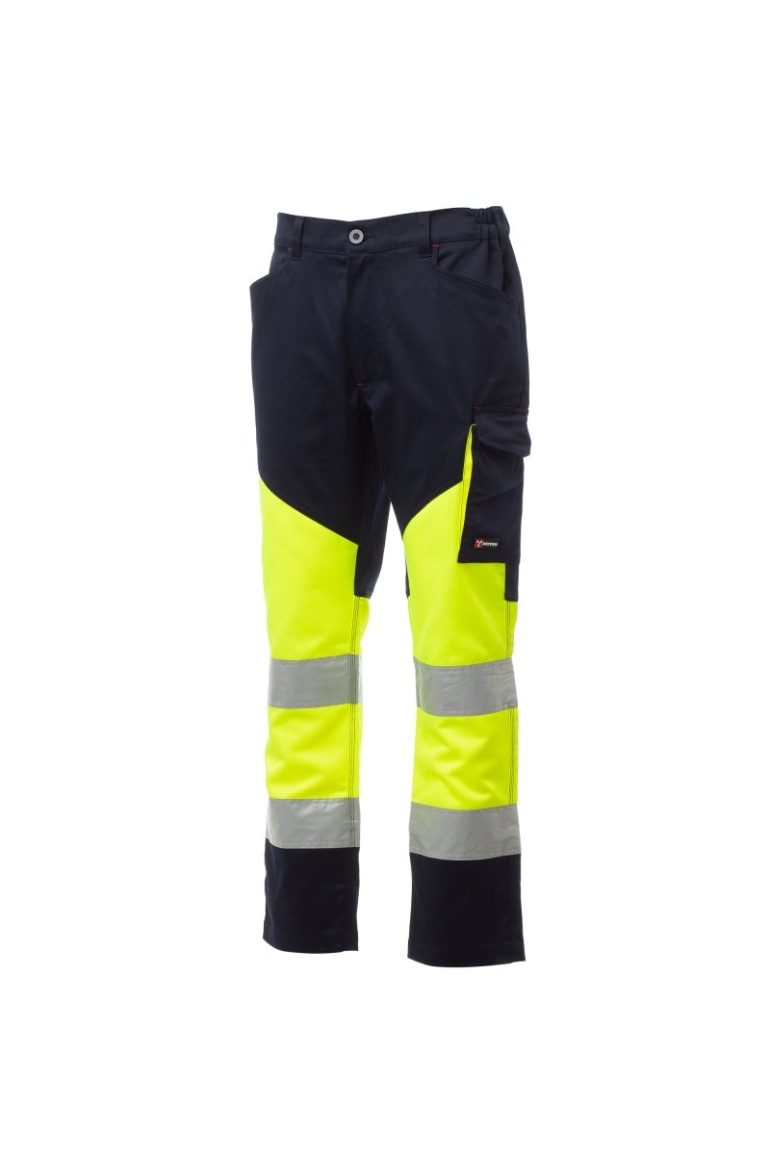 NADRÁGOK_CARGO_Uniszex, többévszakos, kéttónusú, jól láthatósági nadrág, fényvisszaverő szalagok, gumírozott derék és övbújtatók. Cipzáras és műanyag gombos záródás, két szabott elülső zseb, az egyik oldalzseb LOCK SYSTEM zárással és kivehető jelvénytartóval, a másik dupla mérőszalagtartóval. Két hátsó zseb: az egyik nyitott fényvisszaverő szalaggal, a másik pedig hajtókával és tépőzárral. Színben illő varrás, amely kontrasztos az anyaggal. Az ülepen és a belső lábszáron háromszoros tűvarrással. Az L nemzetközi méret 80 cm-es belső lábszárrésszel rendelkezik.